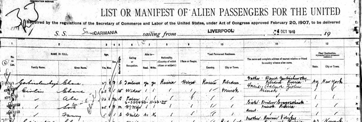 Cirlin Chane 48 f w Widow Russia Hebrew Minsk New York son