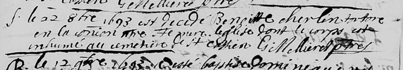 Le 22 8bre 1693 est decede Benoitte cherlin ?????? en la cmion ntre Ste mere leglise dont le corps est inhumé au cemetiere de St cassien.