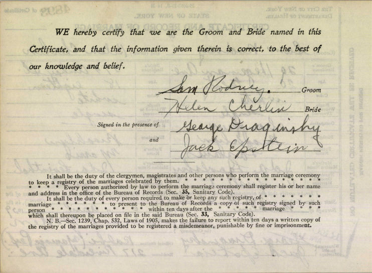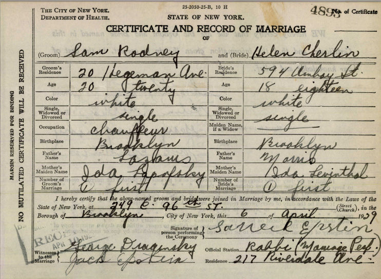 html> Helen Cherlin and Sam Rodney, Marriage record