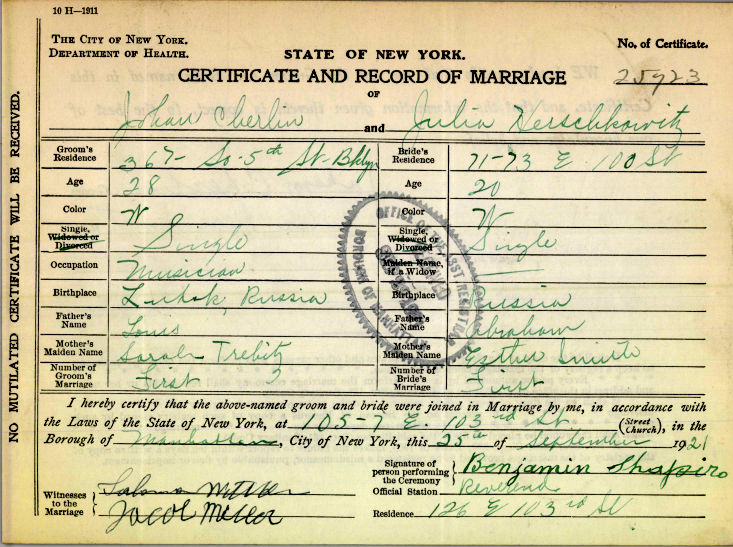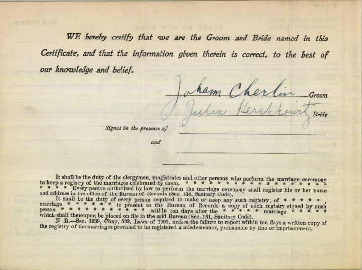 Johann Cherlin and Julia Herschkowitz , Marriage record